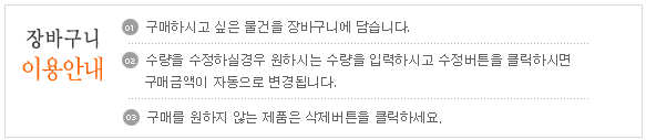 ▷ 수량을 변경하실 경우, 수량에 원하시는 개수(수량)를 입력하신후 바구니수정 버튼을 눌러 주십시오.