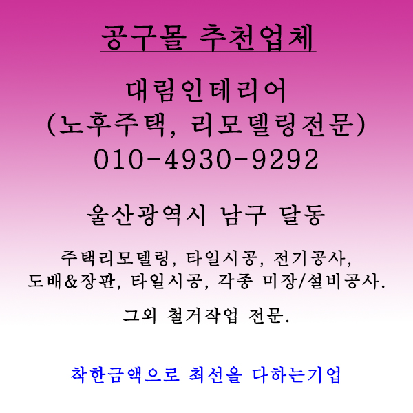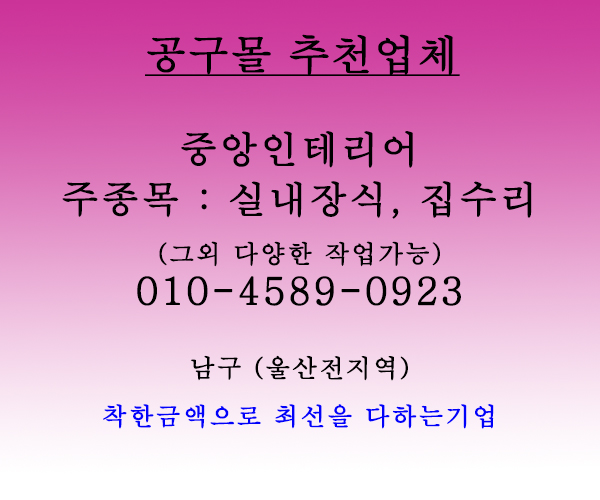 ◆ 안녕하세요 공구몰.kr 홍보마당은 전국 및 울산지역 ◆ 소상공인, diy목공방, 카페, 맞집, 펜션, 인테리어업체, 설비공사, 전기공사업체, 무료에 이용하세요(직접등록하세요) 어려우시면 ☎ 1855-0989 문의 주세요