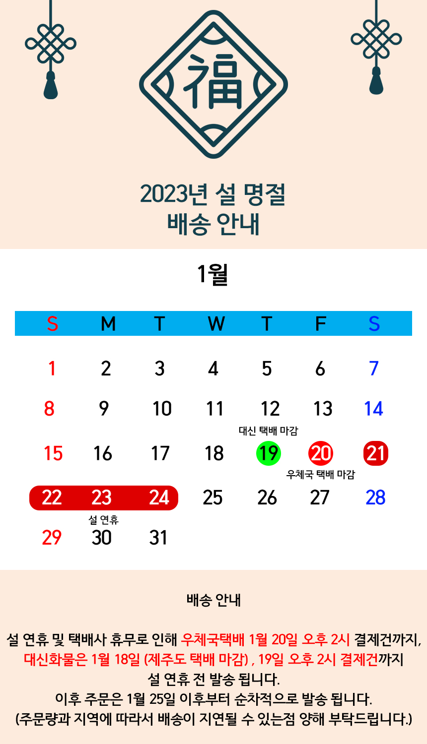 안녕하세요 닥아오는 2023년 설날 배송 및 휴무일 안내드립니다 제주도 및 도서지방은 1월19일까지 주문건은 발송 및 설날전 수령가능 내륙은 우체국택배 발송가능한것(부피큰것 제외) 1월20일 발송은 가능하며 수령은 설날 지나고 받을수 있습니다 이점 양해 바람니다