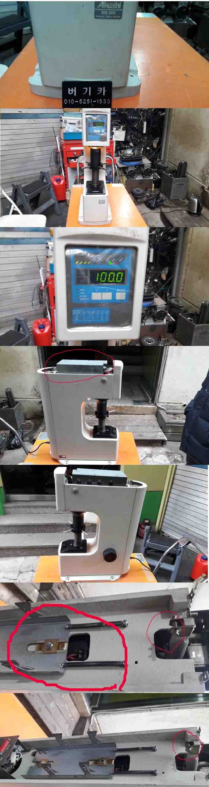 로크웰경도계 ARK-600입니다 적색표시에 부품이 빠진것 같읍니다 그외에 동작이나 외관상태 양호 합니다
