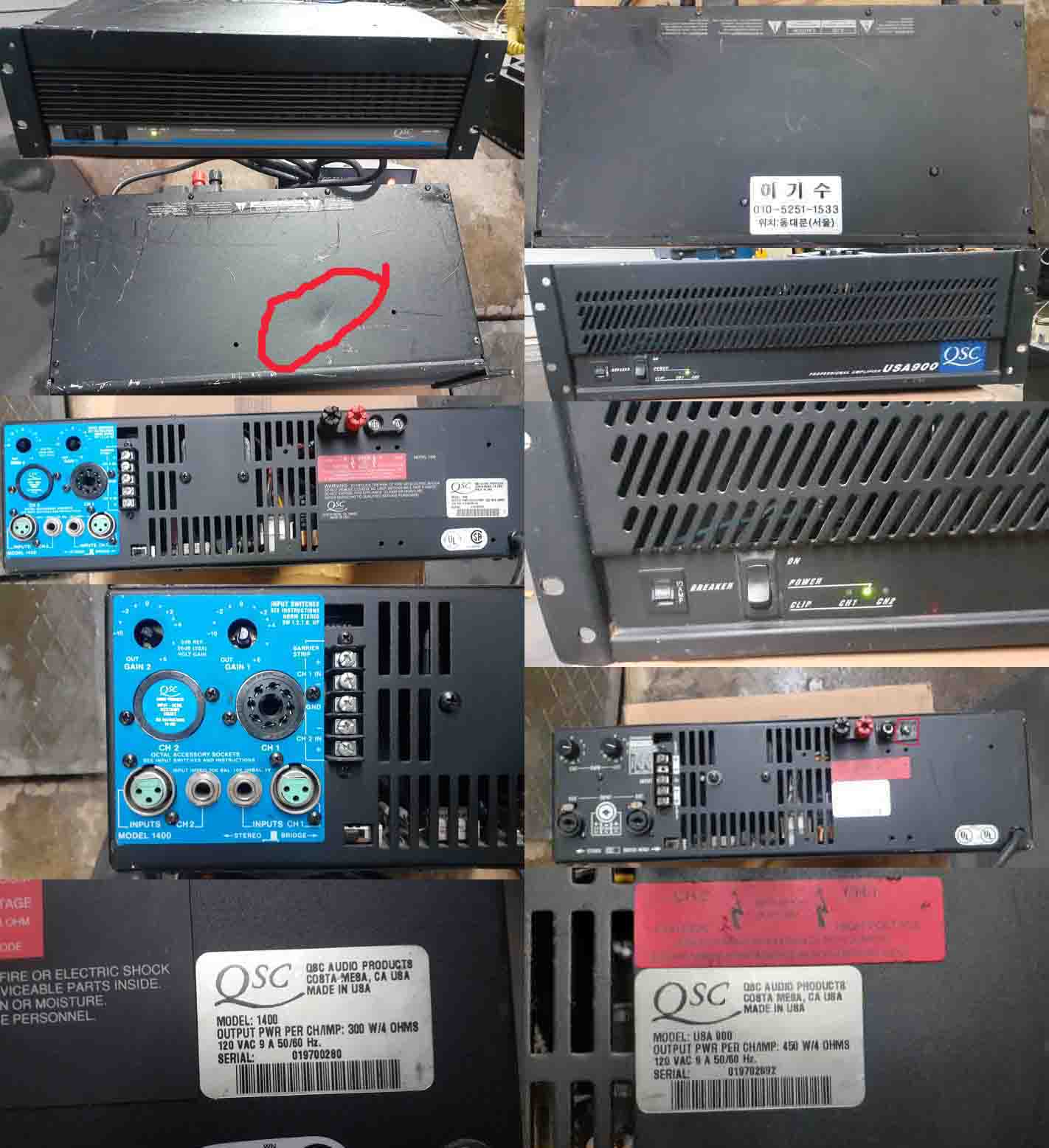 가격인하 U.S.A AMP QSC1400 /QSC USA900 2종 입니다 동작상태 양호 합니다 적색표시사진과같이 한대는 위에 눌린자국이 있읍니다 단자한쪽파손 입니다 그외에 모두 양호 합니다 입력전압은 AC:120VOLT입니다 사진은 실사 입니다 2대일괄가격:40====35만원 화물착불 연락처010-5251-1533 이기수 기업은행:260-000893-03-012