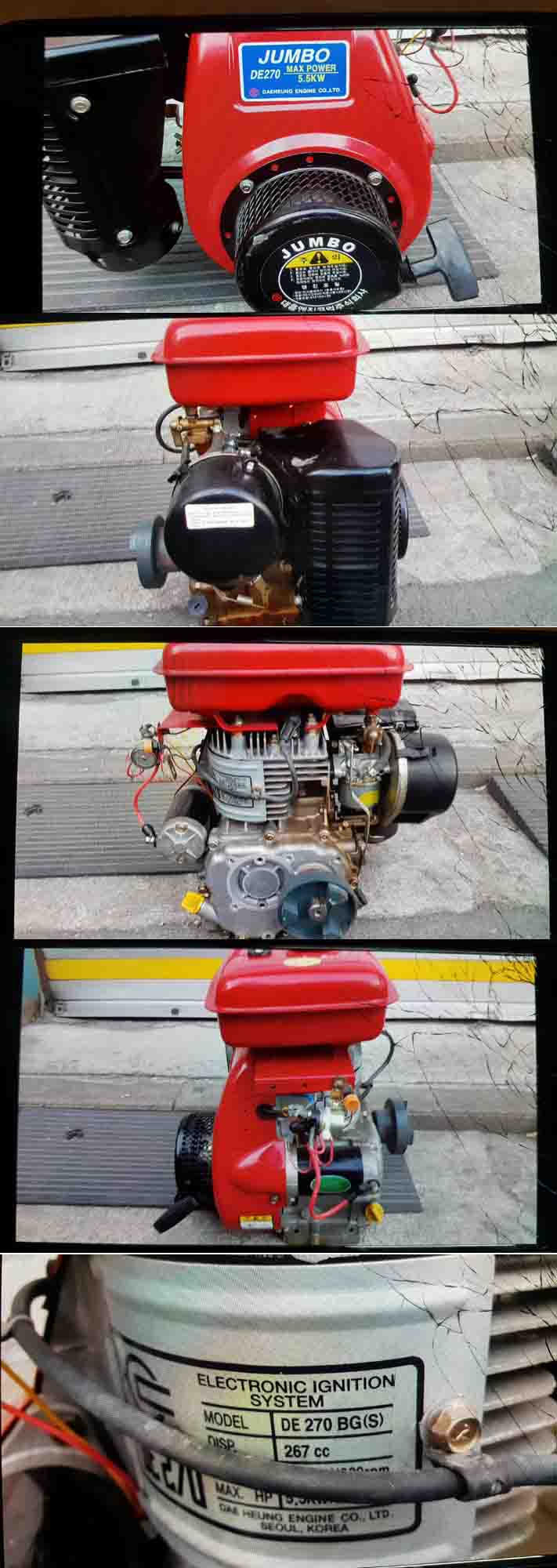 대흥점보 DE270 JUMBO 5.5KW 엔진 입니다 시동은 리코일과 쎄루모터 방식입니다 시동은 수동 자동으로 잘걸림니다 외관 상태 양호 합니다 사진은 실사 입니다
