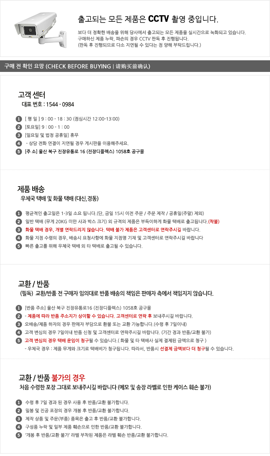 한일전기(주) 전국 어디서나 ☎ 1588-1183 / 080-637-1183 A/S문의 전화(토,일요일 휴무) 참고사항 : 제품무게가 30Kg 이상 제품은 착불배송 (일반 정기화물편 일익배송) |