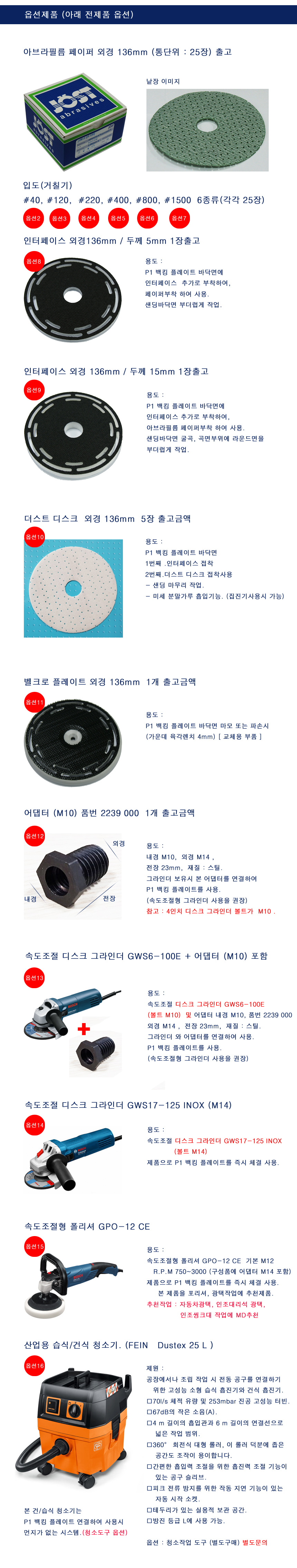 샌딩시스템 옵션 아브라필름(페이퍼,(25장) #40 / 633-Z-40 아브라필름(페이퍼,(25장) #120 / 633-Z-120 아브라필름(페이퍼,(25장) #220 / 633-Z-220 아브라필름(페이퍼,(25장) #400 / 633-C-400 아브라필름(페이퍼,(25장) #800 / 633-C-800 아브라필름(페이퍼,(25장) #1500 / 633-C-1500 인터페이스 5mm 1장 / AD-136-5 인터페이스 15mm 1장 / AD-136-15 더스트 디스크 5장출고 / STS-136 벨크로 플레이트 136mm / JOST-KP-136 어댑터 M10-->M14 = 1개 / 2239000 (울프) 속도조절디스크 (보쉬,GWS6-10E) + 어댑터M14 포함 / 0601375740 속도조절디스크 (보쉬,GWS17-125) M14 / 060179M0B2 속도조절 폴리셔 GOP12CE / MD추천 제품 / 06013890B0 독일 FEIN 집진기(연동형 25L) / Dustex25L