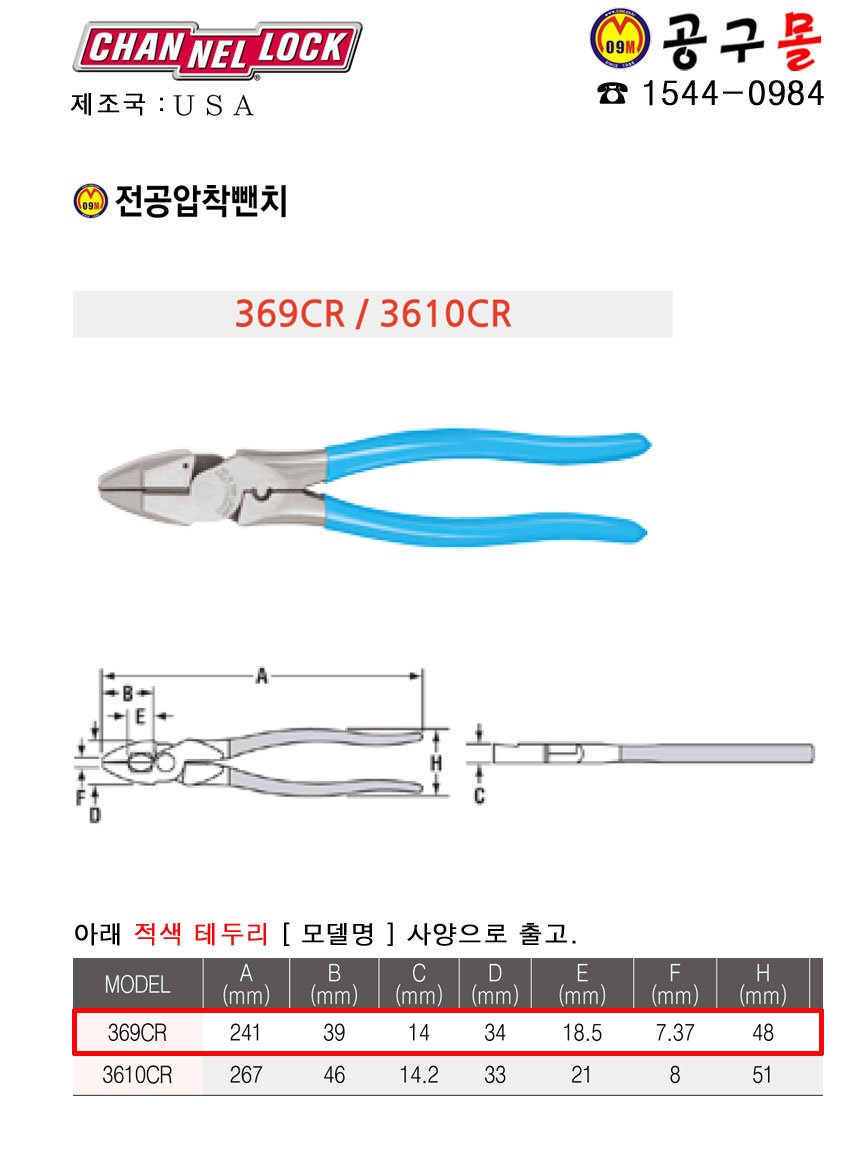 전공압착뺀치 369CR CHANNEL LOCK,압착밴찌,전공밴치,공구몰