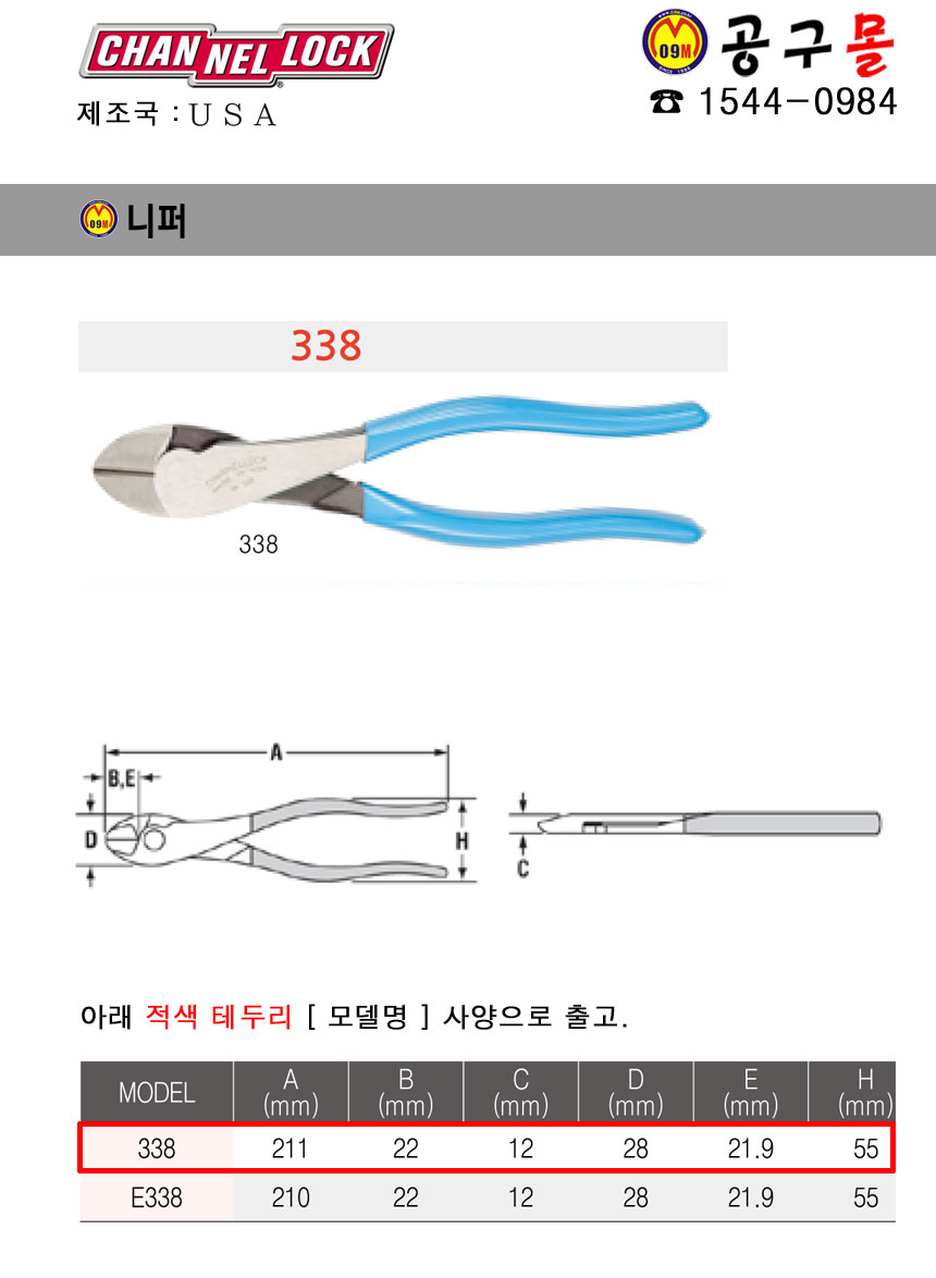 니퍼 338 CHANNEL LOCK,작업공구, 공구몰