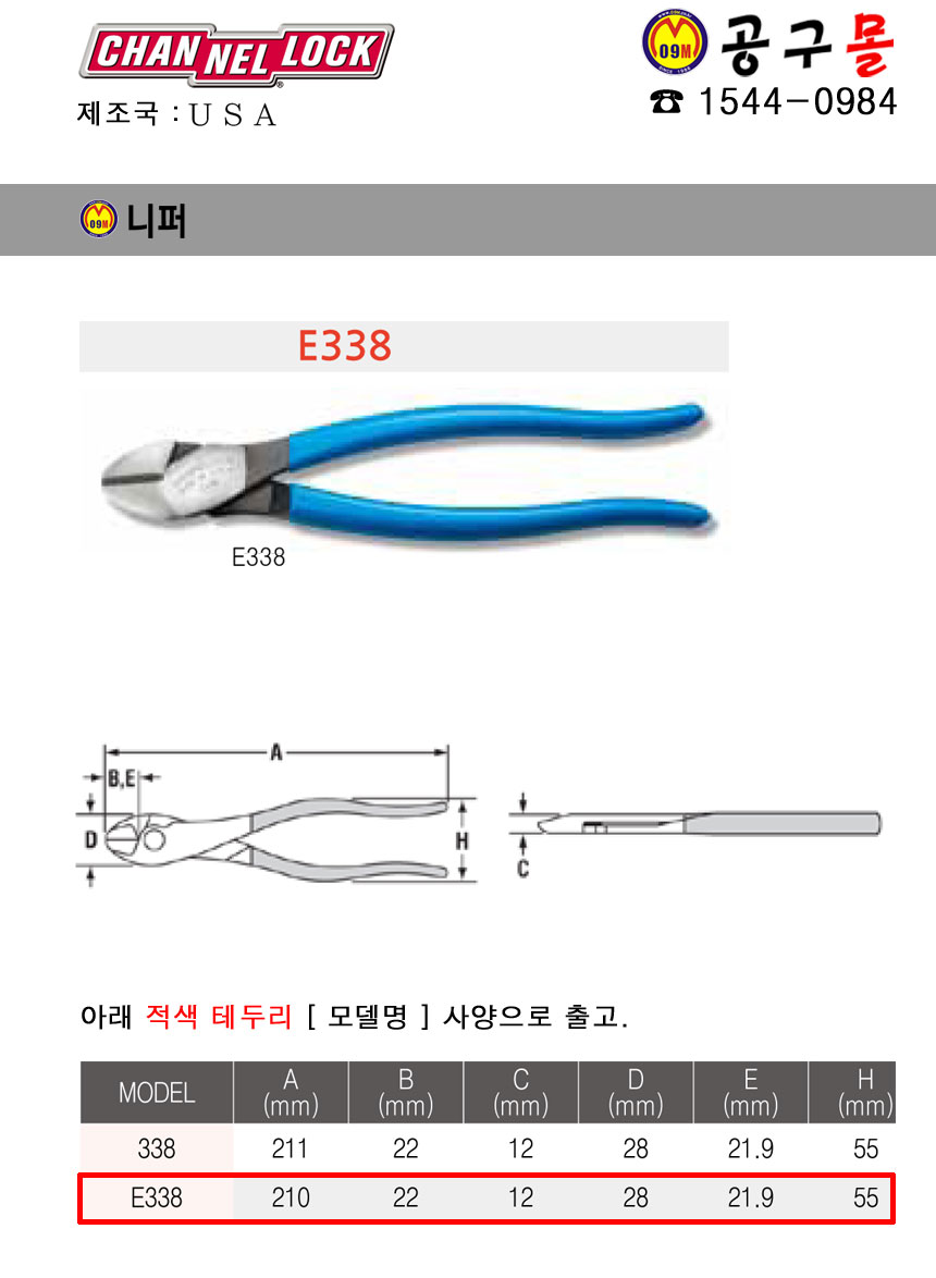 니퍼 E338 CHANNEL LOCK,작업공구, 공구몰