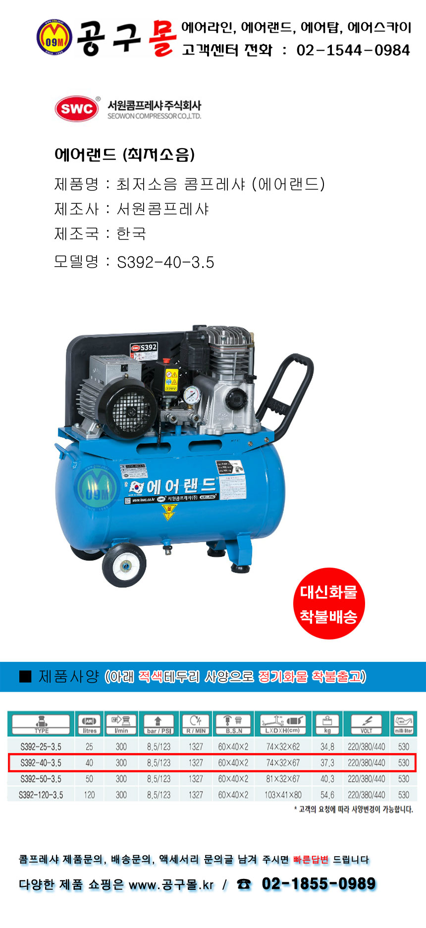 서원 최저소음 콤프레셔 S392-40-3.5, 3.5HP-220V 에어랜드, 콤프레샤, 공구몰