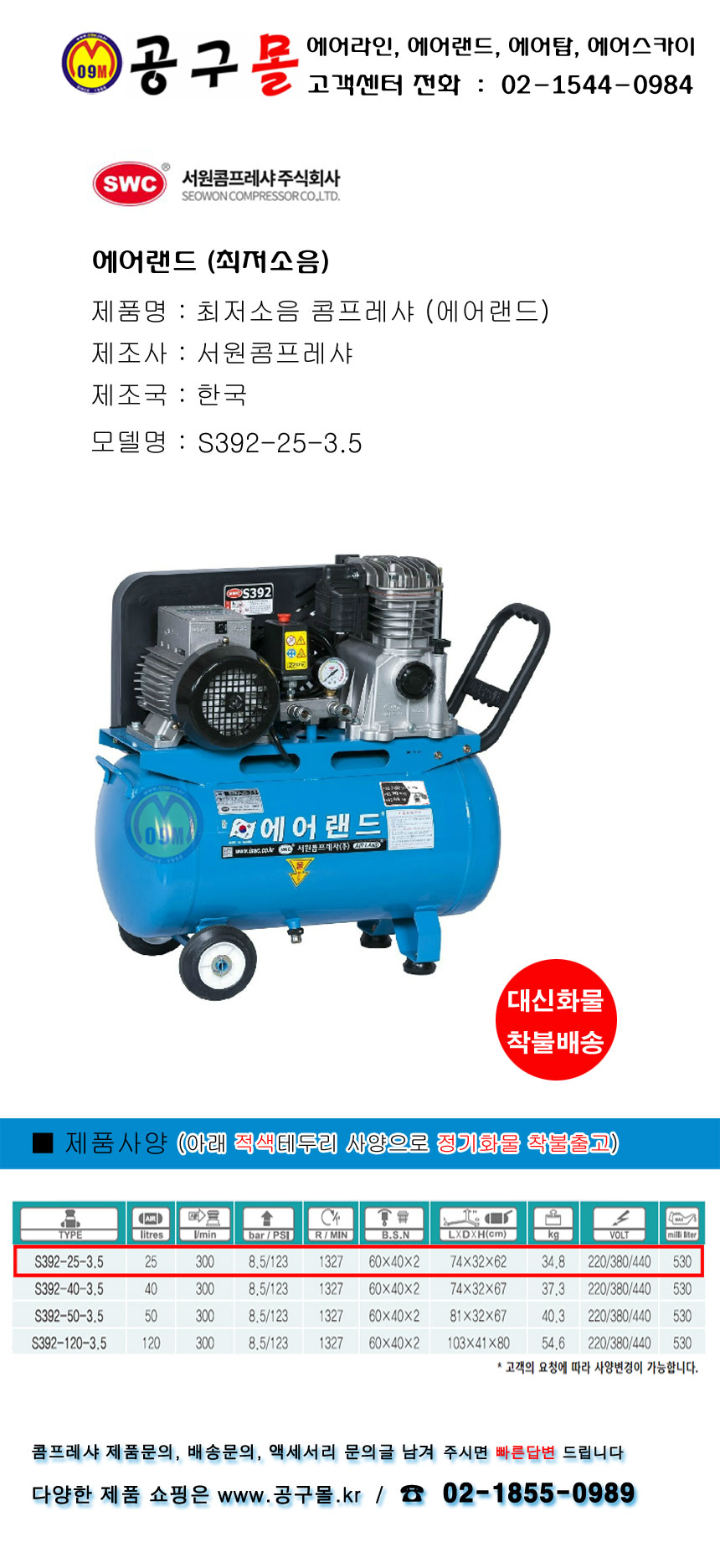 서원 최저소음 콤프레셔 S392-25-3.5, 3.5HP-220V 에어랜드, 콤프레샤, 공구몰