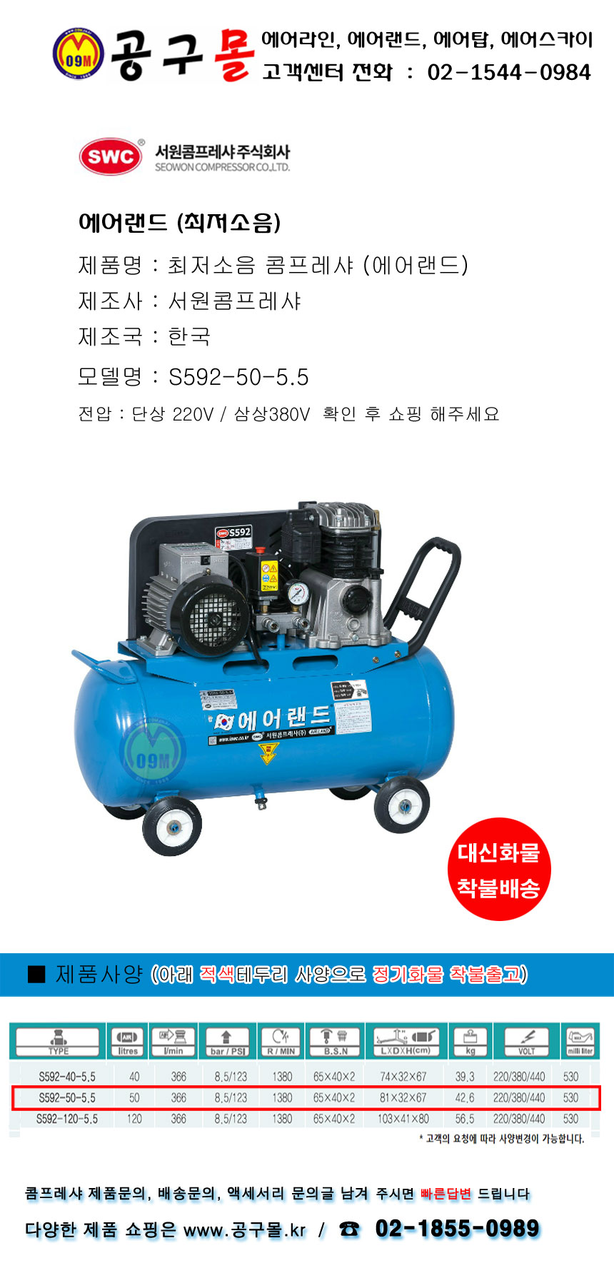 서원 최저소음 콤프레셔 S592-50-5.5, 5.5HP-220V 에어랜드, 콤프레샤, 공구몰