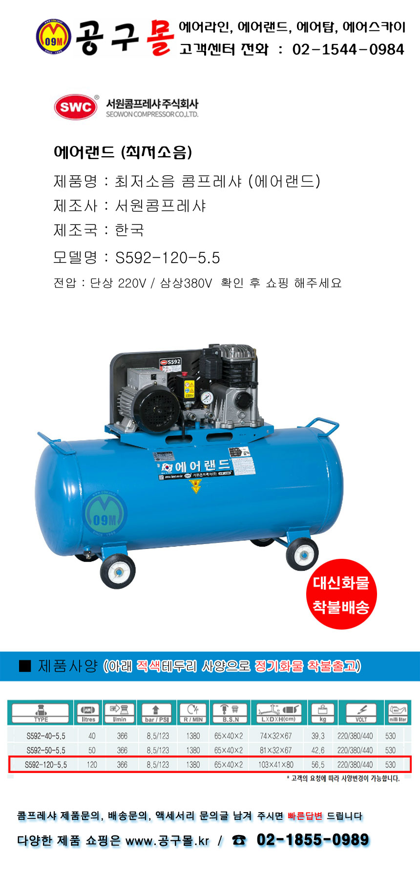 서원 최저소음 콤프레셔 S592-120-5.5, 5.5HP-220V 에어랜드, 콤프레샤, 공구몰