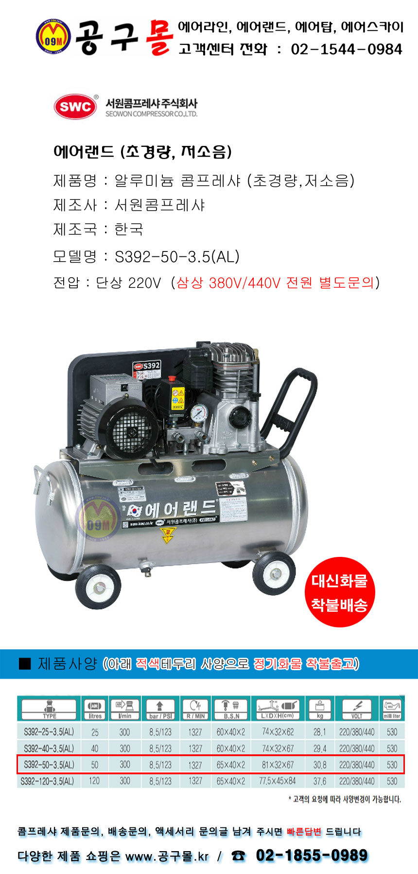 서원 알루미늄 콤프레셔 S392-50-3.5(AL) 3.5HP-220V 에어랜드, 공구몰
