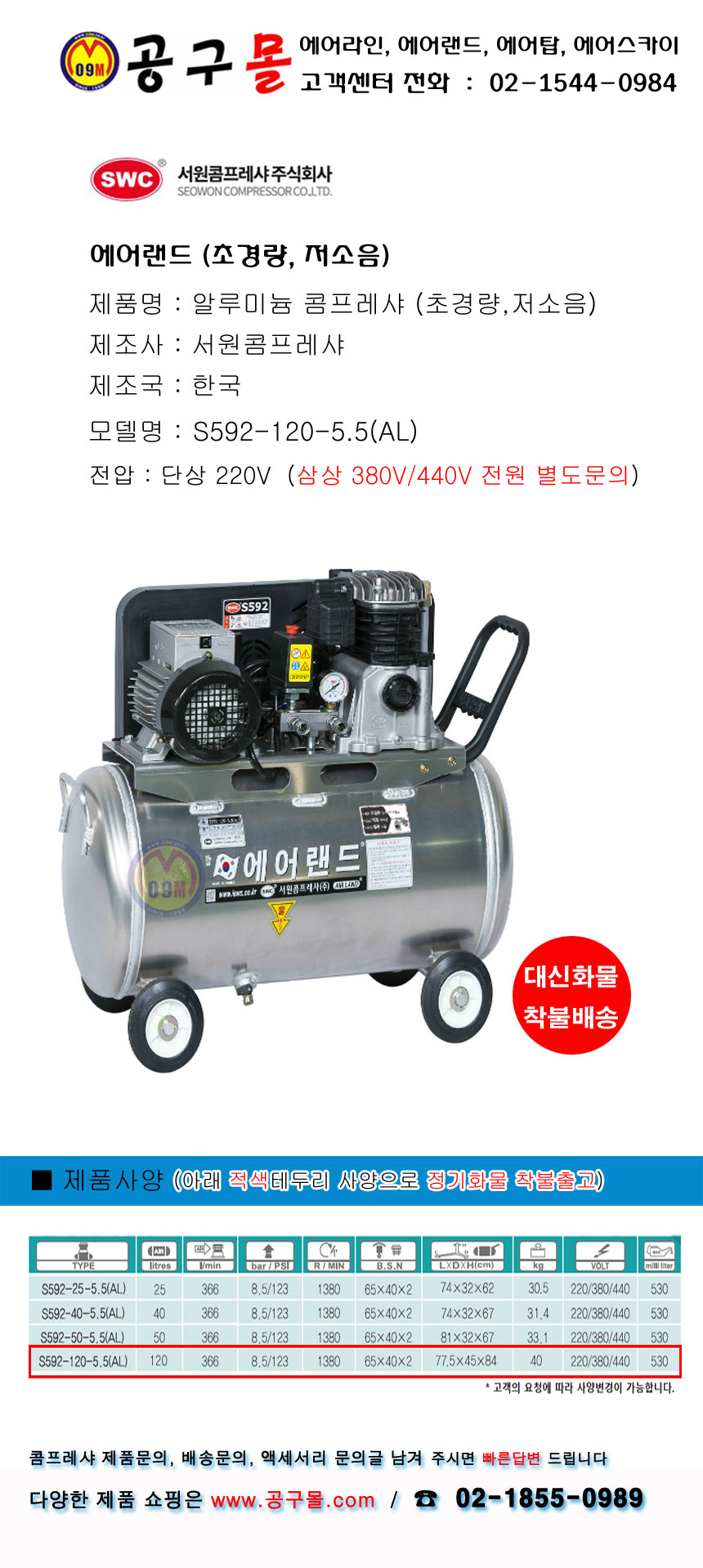 서원 최저소음 콤프레셔 S592-120-5.5, 5.5HP-220V 에어랜드, 콤프레샤, 공구몰