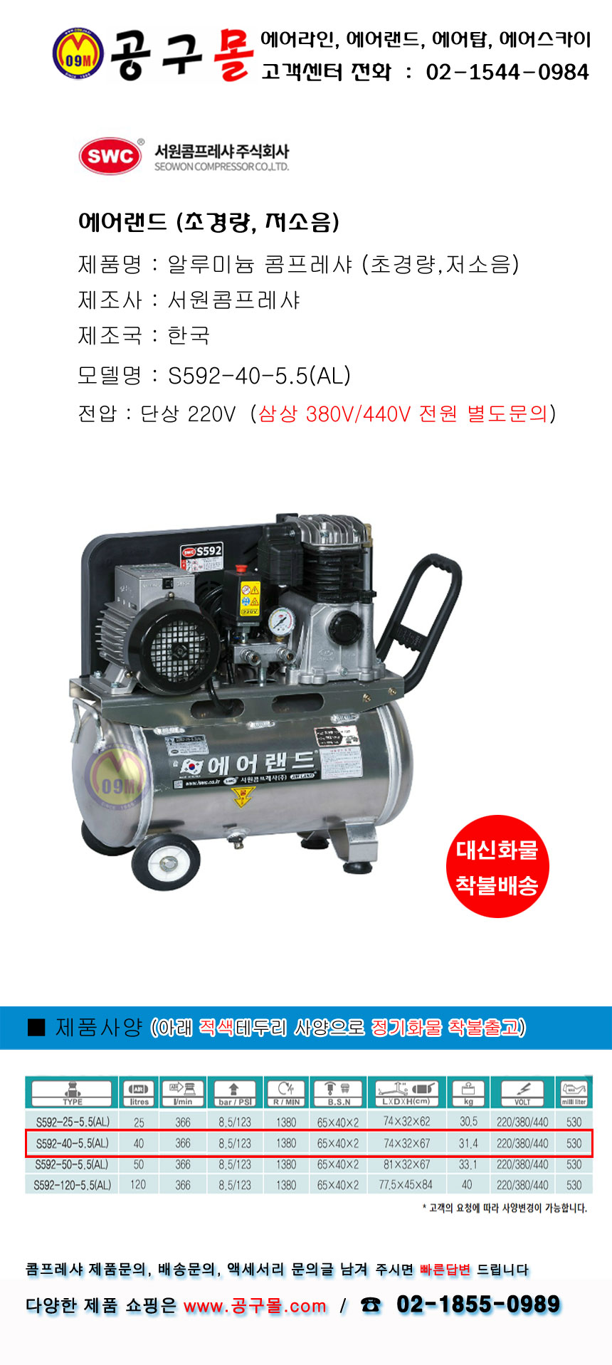 서원 알루미늄 콤프레셔 S592-40-5.5(AL) 5.5HP-220V 에어랜드, 콤프레샤, 공구몰