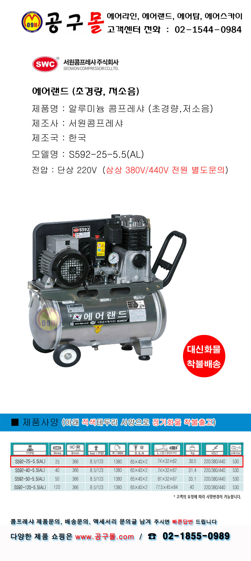 서원 알루미늄 콤프레셔 S592-25-5.5(AL) 5.5HP-220V 에어랜드, 콤프레샤, 공구몰