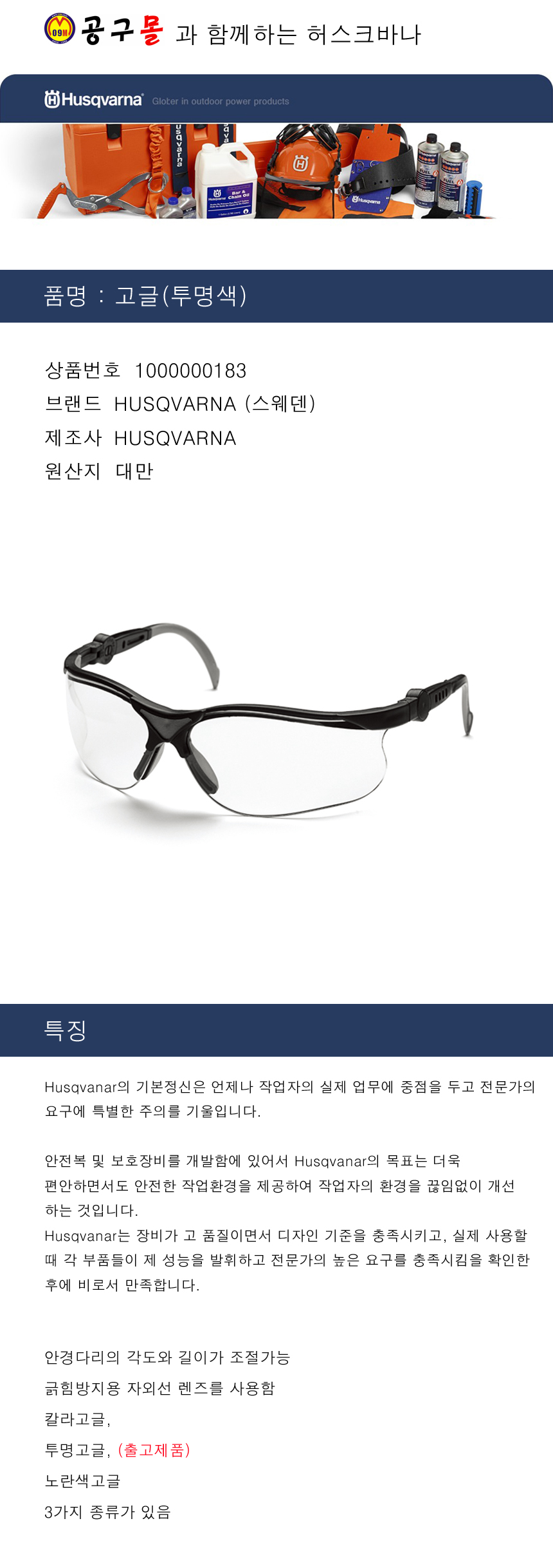 허스크바나 고글안경(투명색) HUSQVARNA, 공구몰, 안전용품