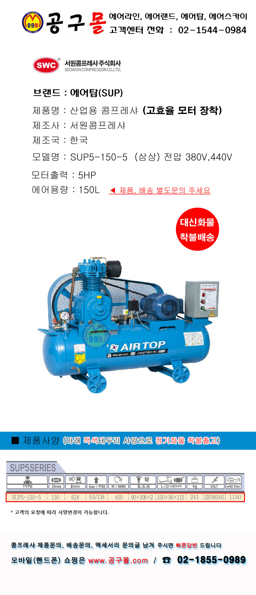 서원 에어탑 콤프레셔 SUP5-150-5, 5HP-삼상-고효율모터, 산업용, 공업용, 콤프레샤, 공구몰