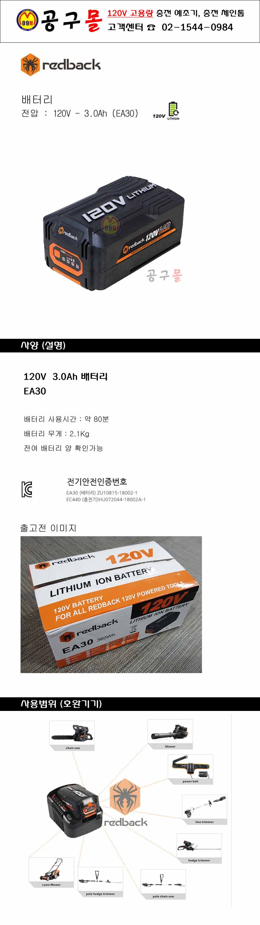 고용량 배터리 EA30 120V-3.0Ah REDBACK,공구몰,R120