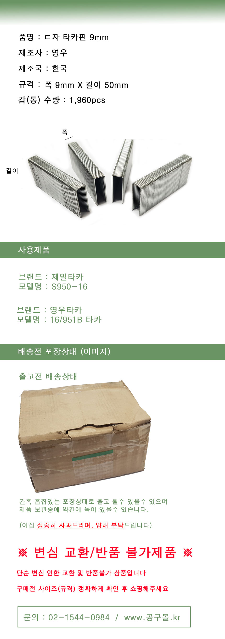 950 타카못 폭9mmx길이50mm 1960pcs 공구몰, 영우