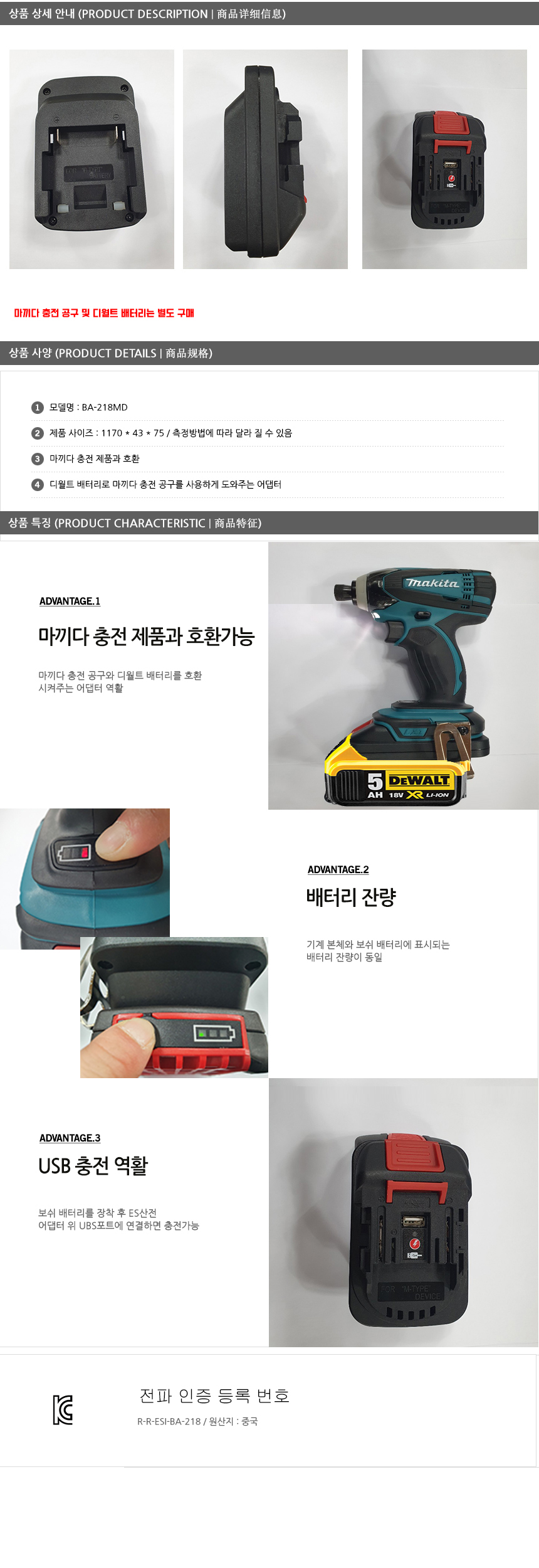 ES산업 배터리 어댑터 BA-218MB ES산업 , 공구몰, 충전기, 배터리, 마끼다