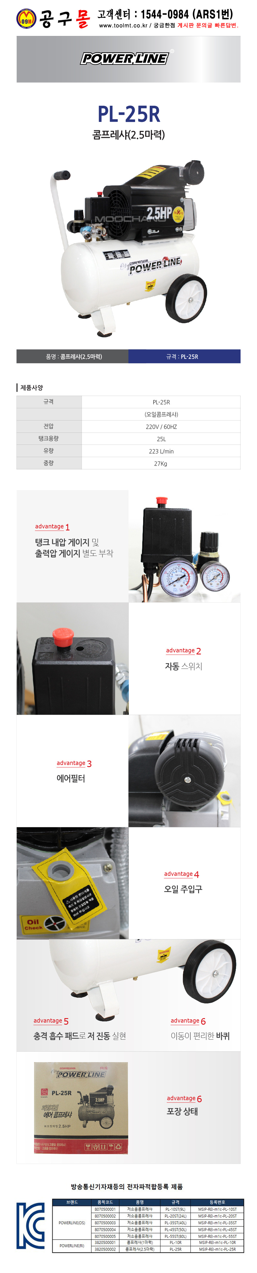 콤프레샤 PL-25R (2.5마력) 파워라인, POWERLINE, 오일타입, 공구몰, PL25R