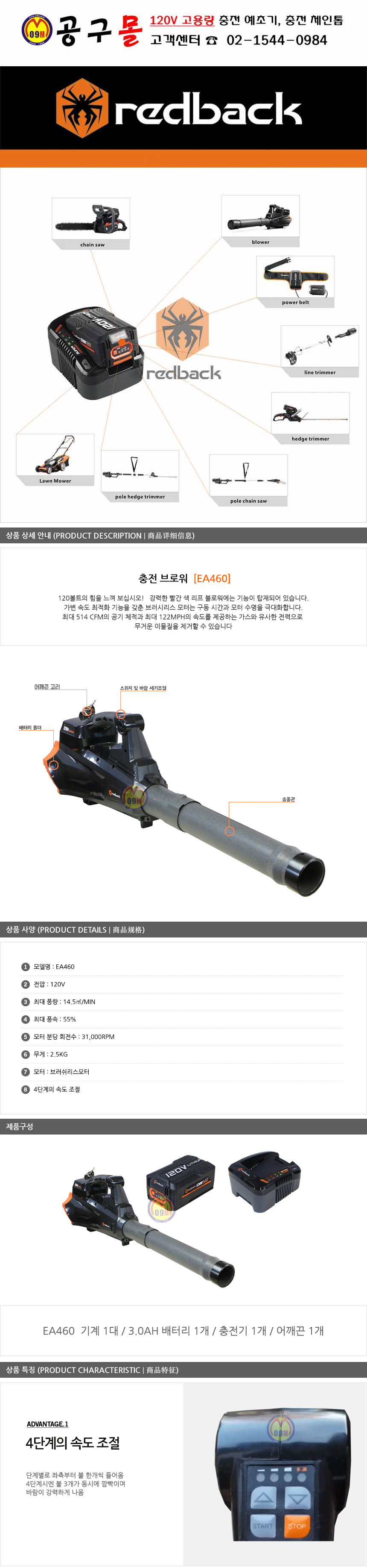 레드백 충전식브로워 EA460 3AH세트(3AH배터리1개), 엔진브로워, 고성능브로워/R120