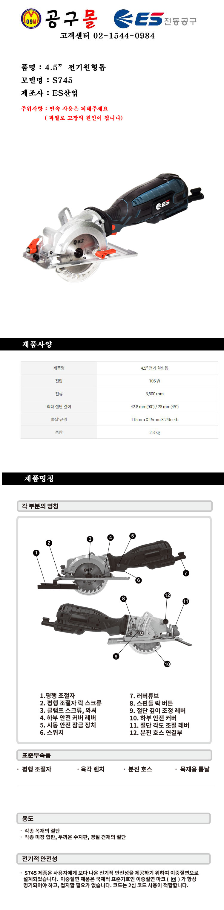 ES산업 미니원형톱 S745 (115mmx15mm) ES산업, 원형톱, 소형워형톱, 전기원형톱, 공구몰