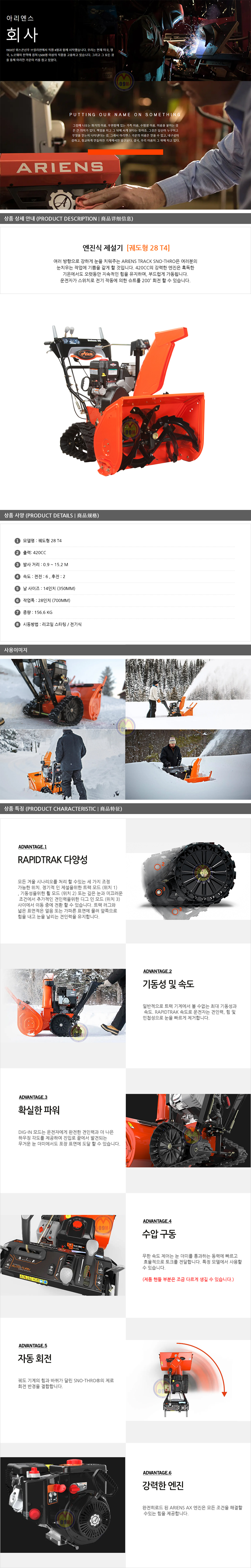 ARIENS 엔진식 제설기 궤도형 28-T4 (420CC) , 아리엔스, 제설기계, 눈치운는기계, 동절기장비