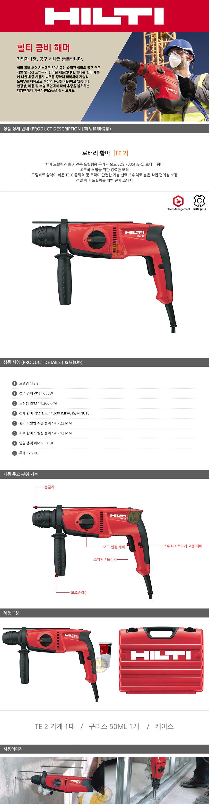힐티 로타리해머드릴 TE2 (650W), 전기햄머