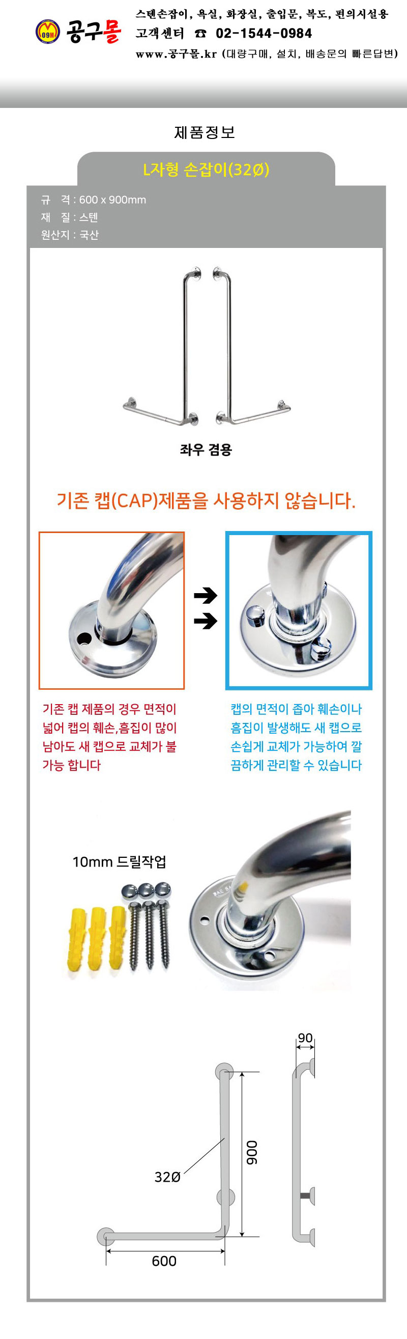 완성 L자형 손잡이 600X900x32 (좌,우 공용) 완성(40) 요양원, 장애인,편의시설