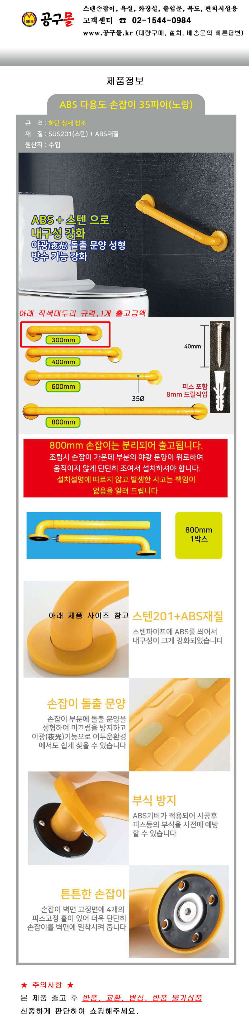 완성 ABS 다용도 손잡이(노랑) 35x300mm, 완성(40) 요양원, 장애인,편의시설