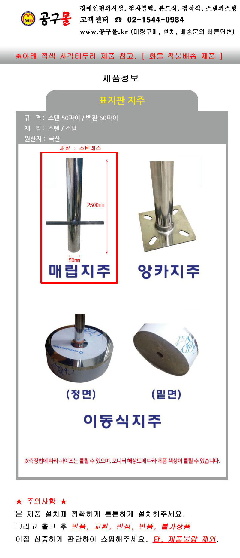 완성 스텐매립식 지주(기둥) 50xH2500 완성(39) 주차, 금지, 표지판기둥