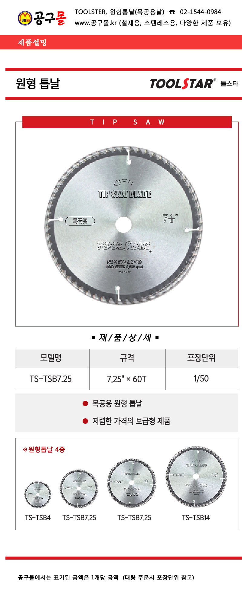 툴스타 목공용 원형톱날 TS-TSB7.25(60T) 툴스타,목공용톱날,목공톱,8809016300782