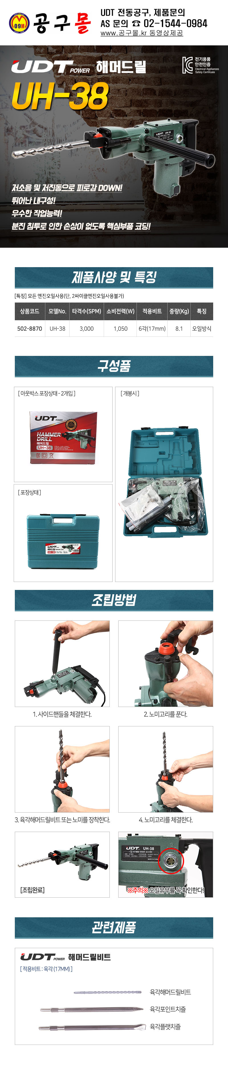 UDT 육각 해머드릴(중량) UH-38 1050W, UDT해머드릴, UH38, 502-8870