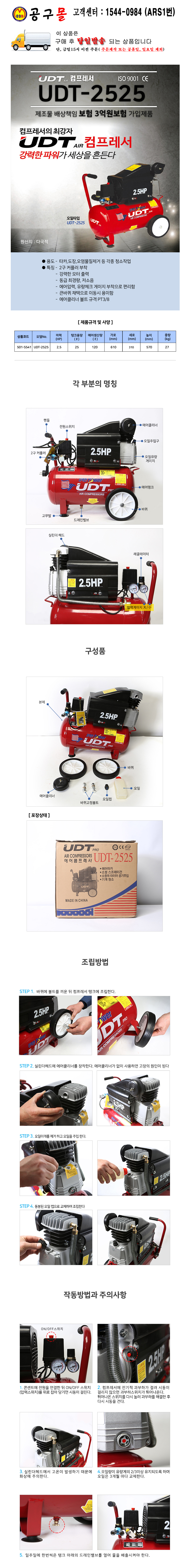UDT 휴대용 오일 콤프레샤 UDT-2525 (2.5HPx25L) UDT공구몰/콤프레샤/컴프레샤 500-5541