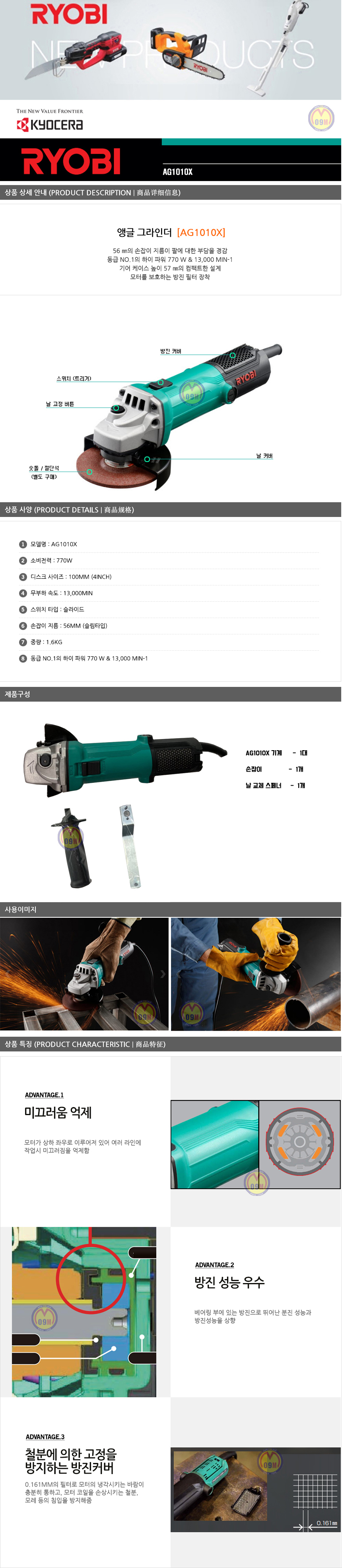 교세라 그라인더 AG1009 (1010W 11000RPM) 앵글그라인더, 충전그라인더, 절단기