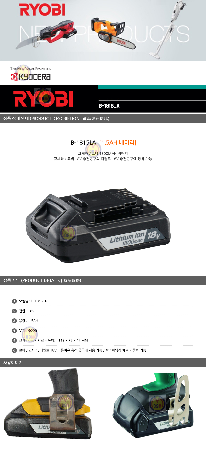 교세라 배터리 B-1815LA (18V 1.5AH) 디월트 충전공구, 충전기