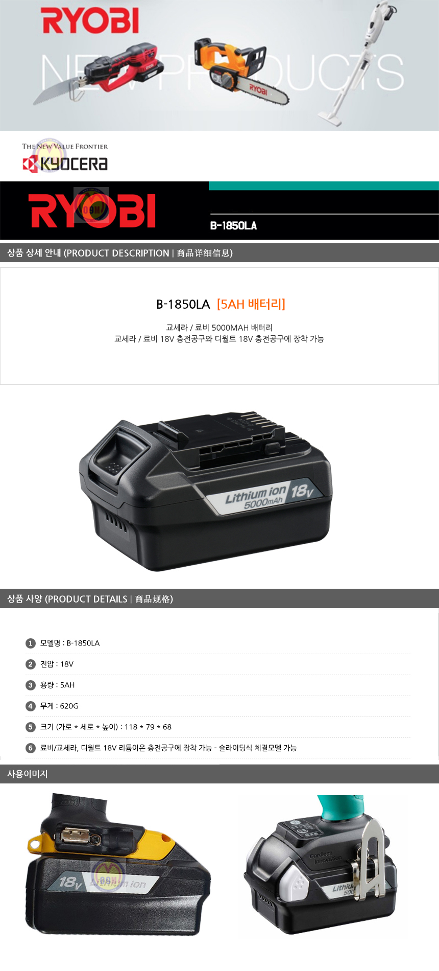 교세라 배터리 B-1850LA (18V 5.0AH) 디월트 충전공구, 충전기