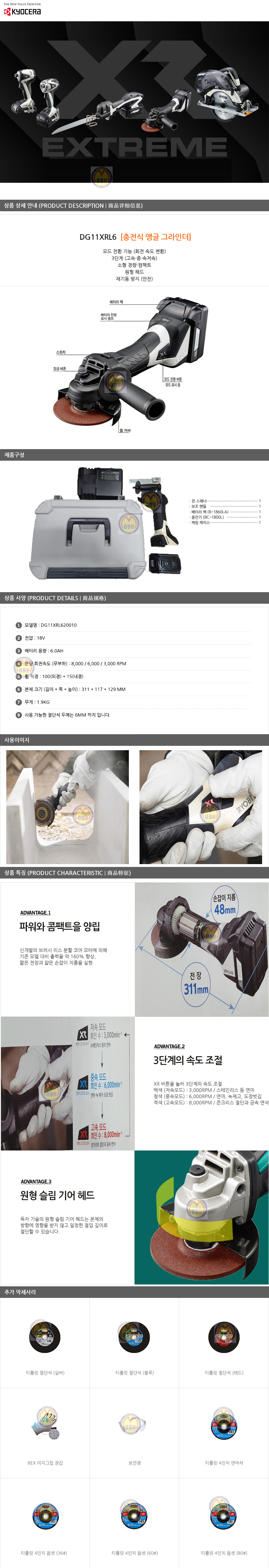 교세라 충전그라인더 DG11XRL6 (18V,6Ah,1B) KYOCERA, 그라인더, RYOBI, 료비