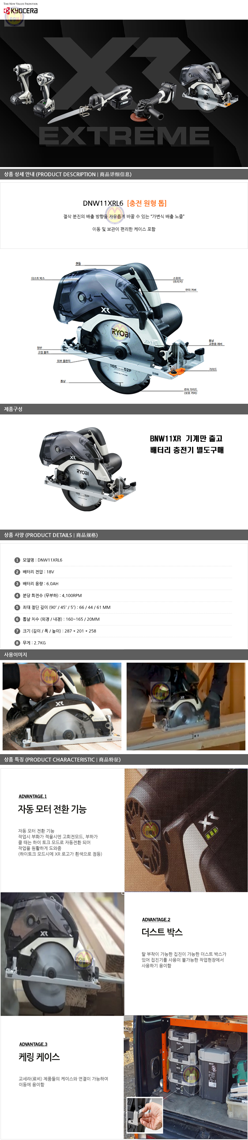 교세라 충전원형톱 DNW11XRL6 (18V,6Ah,1B) KYOCERA,충전톱, RYOBI, 료비, 전동톱, 전기톱, 먼지없는톱