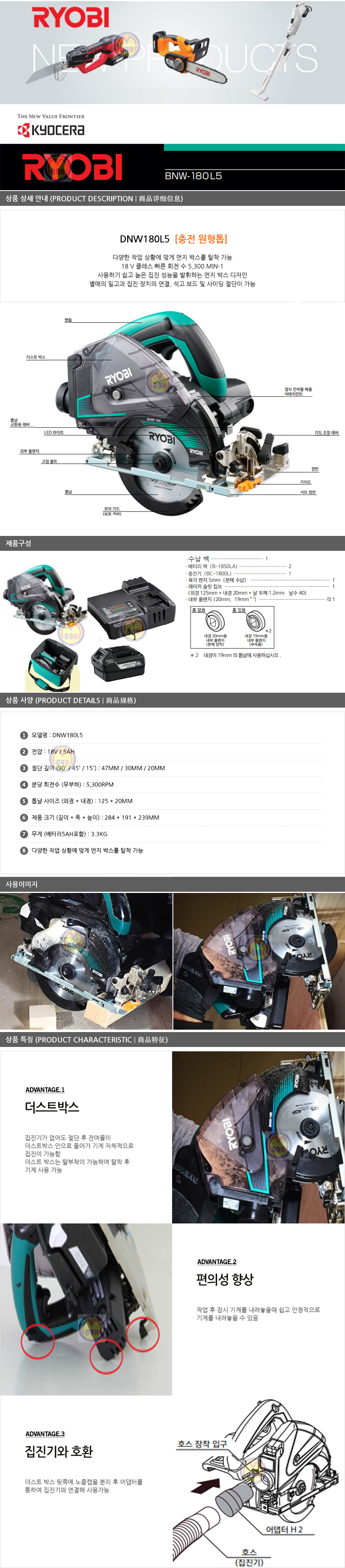 교세라 충전원형톱 DNW180L5 (18V,5Ah,2B) KYOCERA,충전톱, RYOBI, 료비, 전동톱, 전기톱, 먼지없는톱