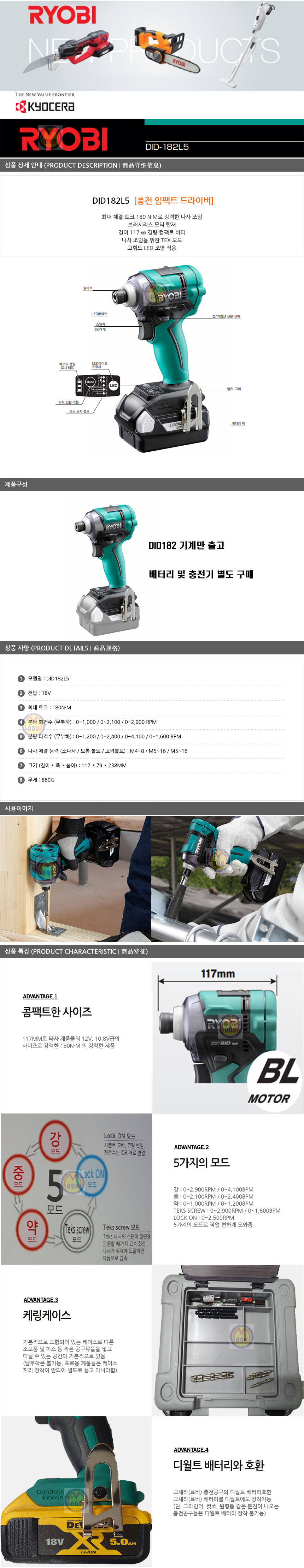 교세라 충전임팩트드라이버 DID182L5 (18V,5Ah,2B) KYOCERA, 료비, RYOBI, 충전드라이버, 임팩드라이버