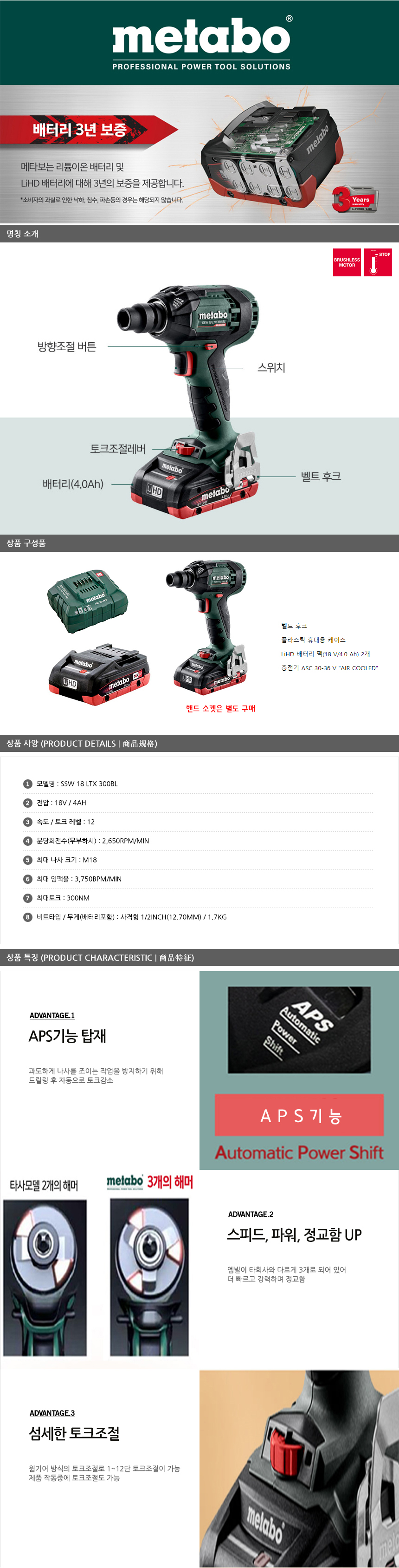 메타보 충전임팩렌치 SSW 18 LTX 300 BL(18V,4Ah,2B), 300Nm, APS기능, METABO, 충전드릴, 충전드라이버,602395720