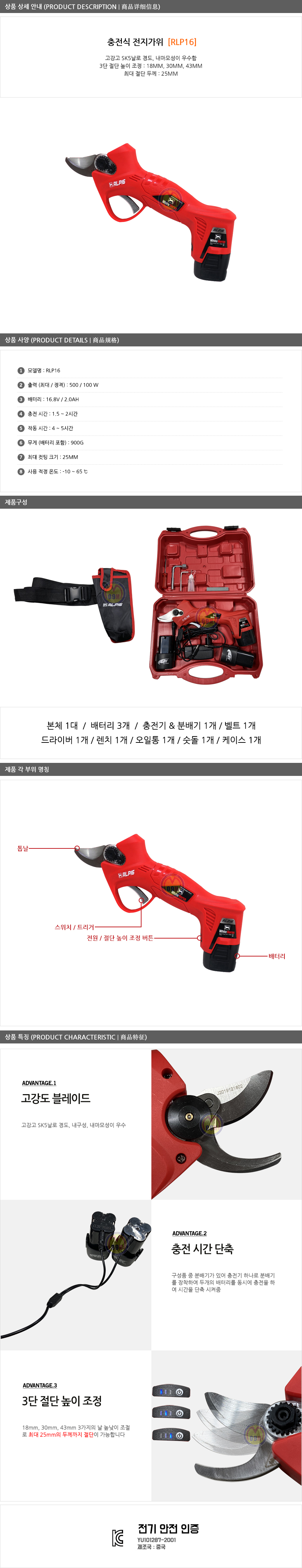 백마 충전전지가위 RLP16 (16V- 3개,2.0Ah) ,전지가위, 정원공구, 충전공구