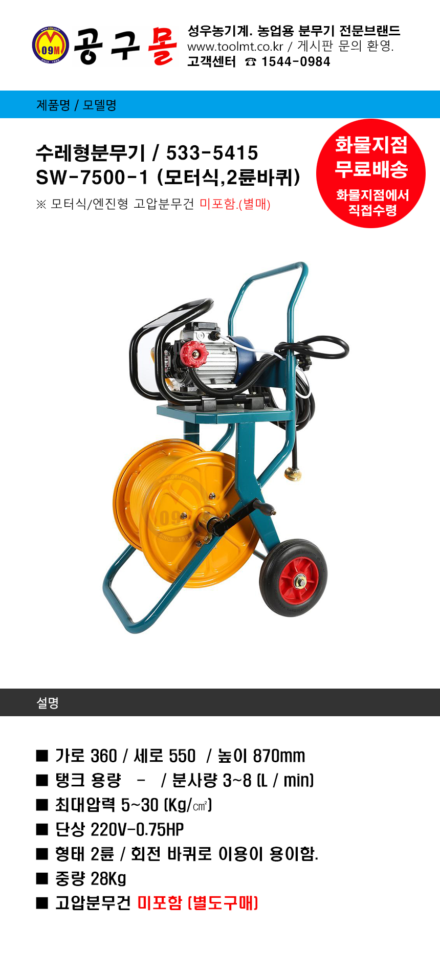 모터식 수레형분무기 SW-7500-1 (220V-0.75hp,2륜) 분무건별매, 성우농기계, 5335415