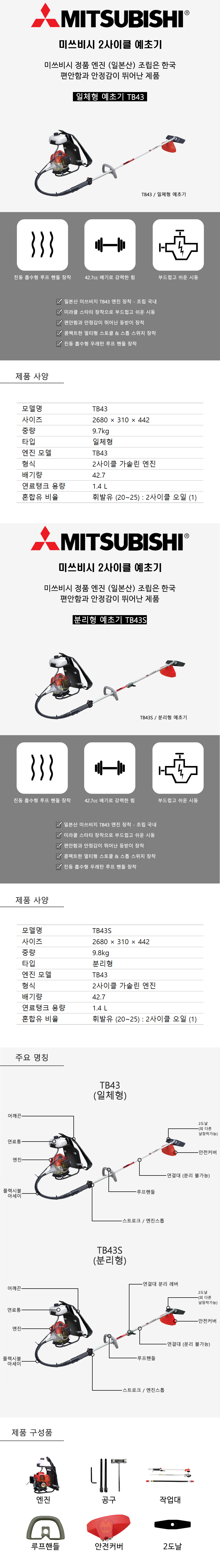 북성 일체형 2사이클 엔진예초기 TB43, TB43S 2행정, 제초기, 벌초기, 공구몰.