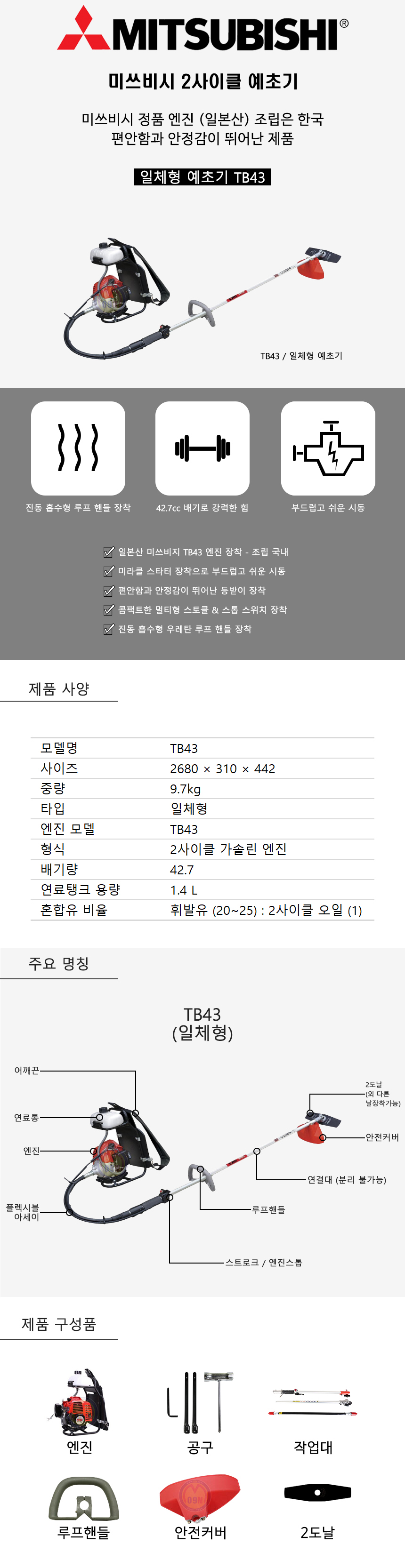 북성 일체형 2사이클 엔진예초기 TB43, TB43S 2행정, 제초기, 벌초기, 공구몰.