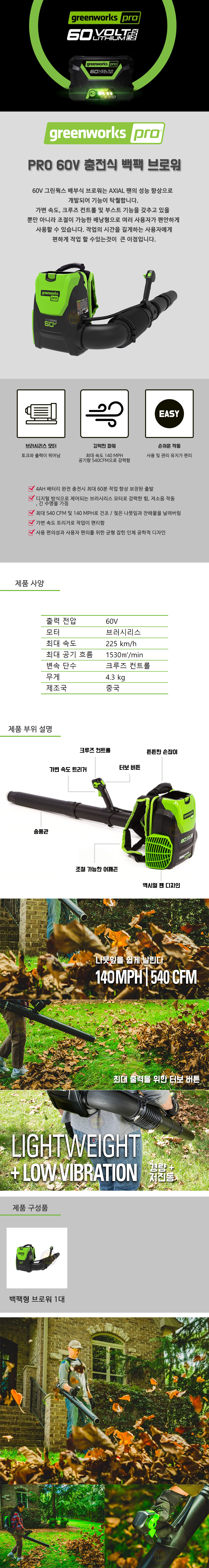 그린웍스 60V 673 백팩브로워 (5Ah2개 세트) 송풍기, 청소기, 낙엽청소기, 공구몰