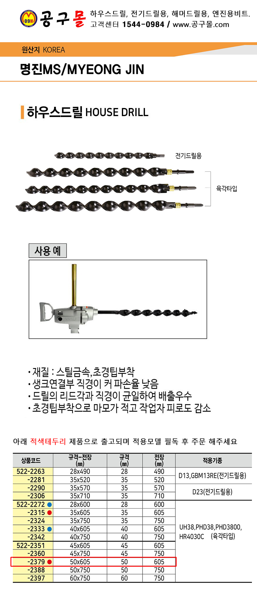 하우스드릴 50mmx605mm (육각타입, UH38,PHD38,PHD3800, HR4030C용) 명진ms, 파이프드릴, 하우스길이, 공구몰●