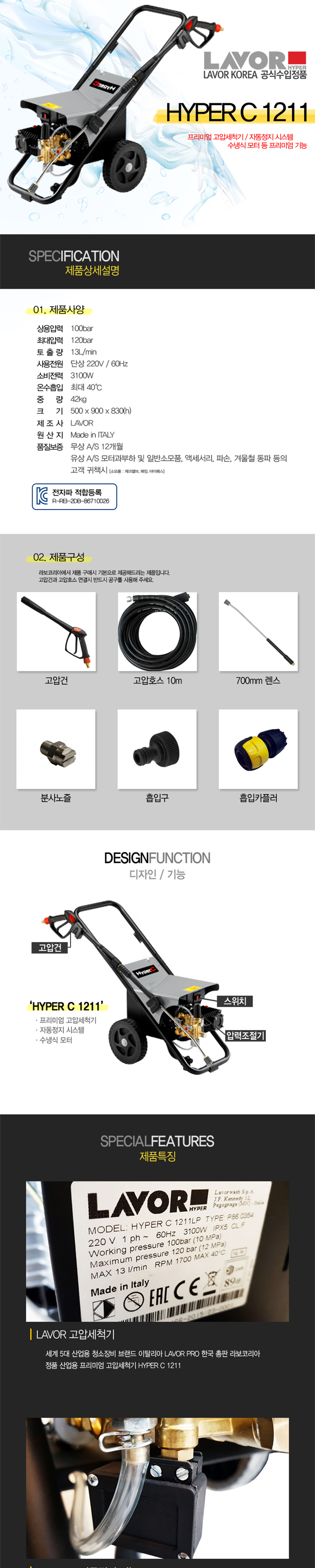 라보 고압세척기 HYPER C 1211(120BAR 220V) 라보, 산업용고압세척기, 물청소기, LAVOR